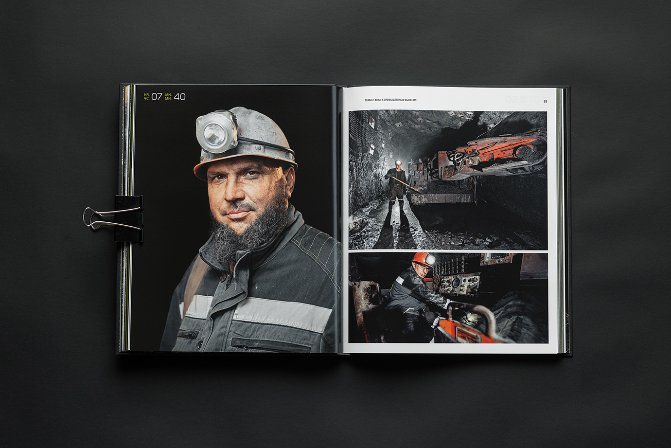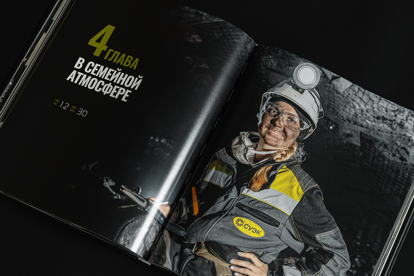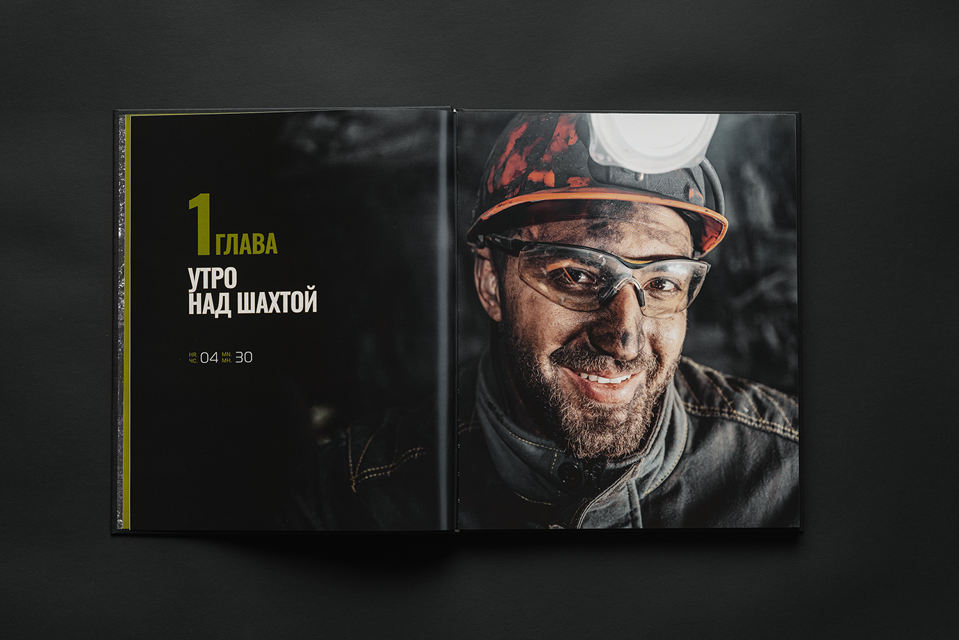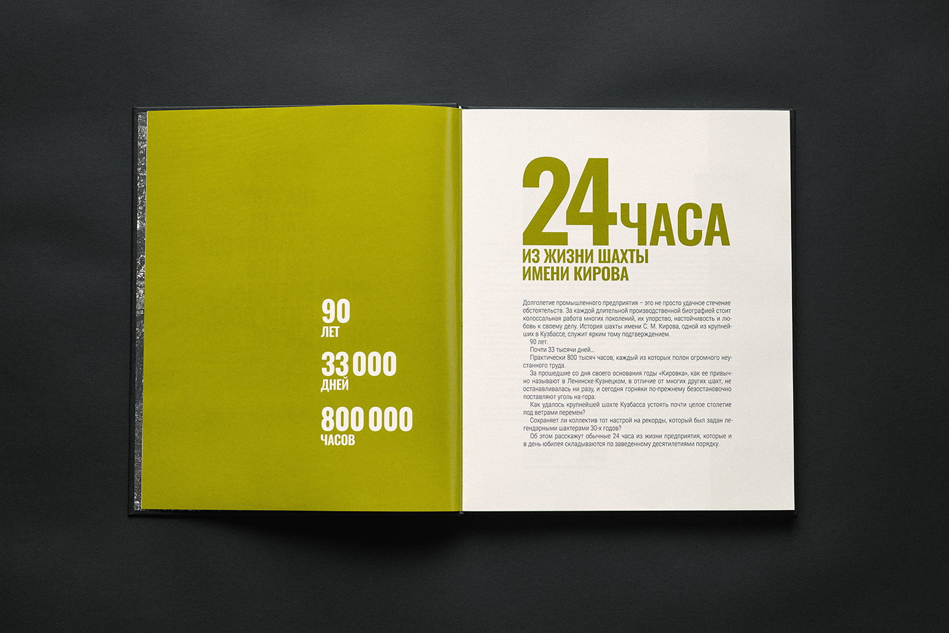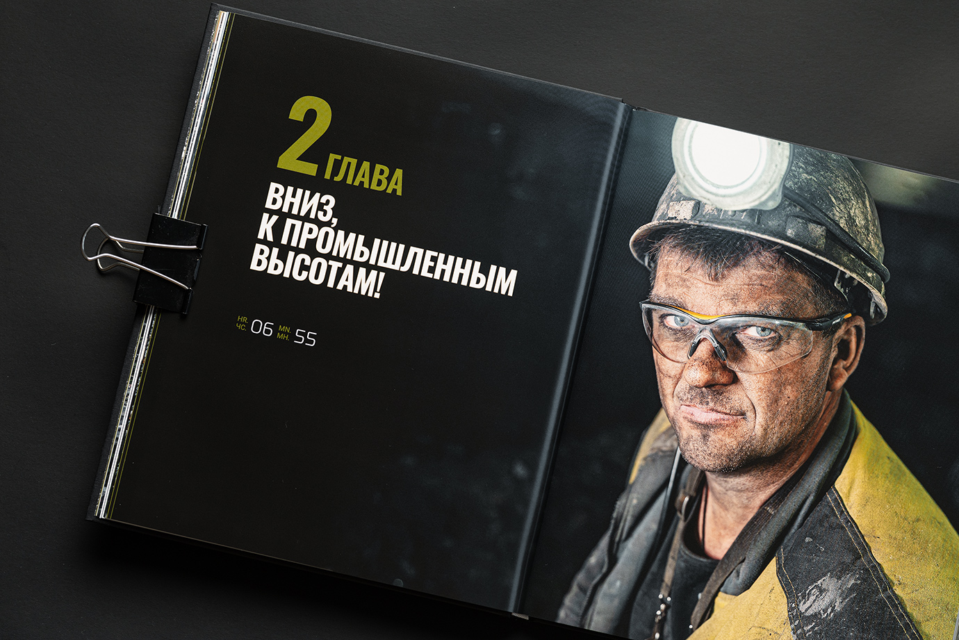 Юбилейная книга для шахты имени Кирова — это честный и подробный портрет предприятия, рассказанный через один рабочий день. В основе концепции — 24 часа из жизни шахты: поминутно выстроенный ритм смен, процессов и людей, которые обеспечивают бесперебойную работу производства.