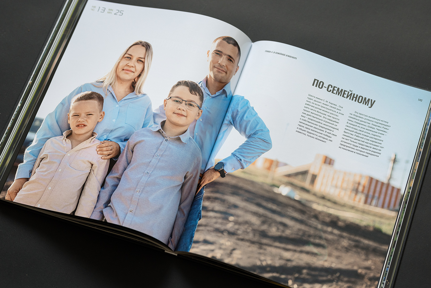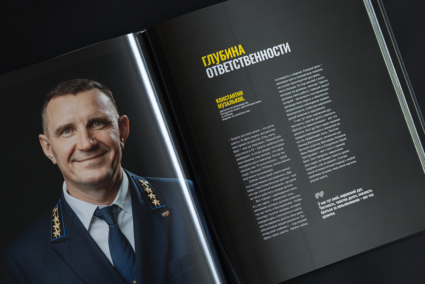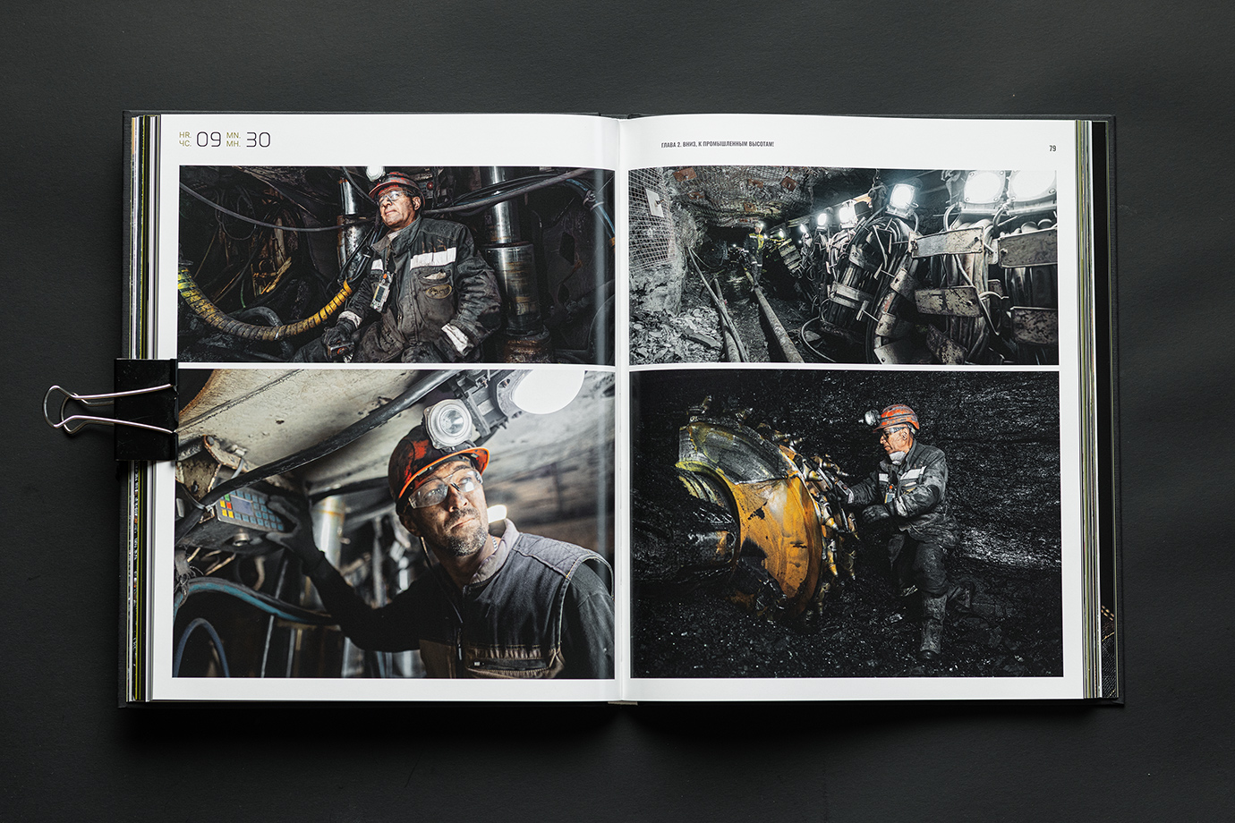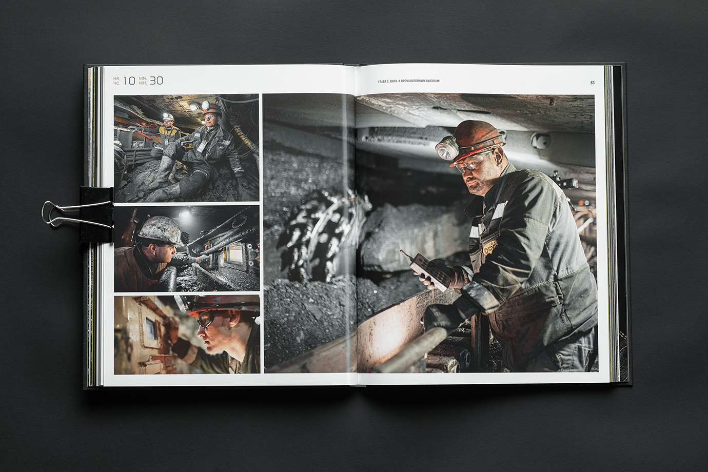 Юбилейная книга для шахты имени Кирова — это честный и подробный портрет предприятия, рассказанный через один рабочий день. В основе концепции — 24 часа из жизни шахты: поминутно выстроенный ритм смен, процессов и людей, которые обеспечивают бесперебойную работу производства.