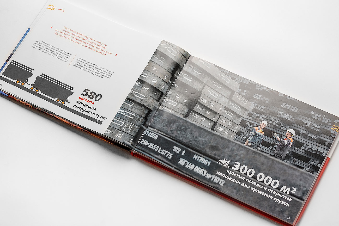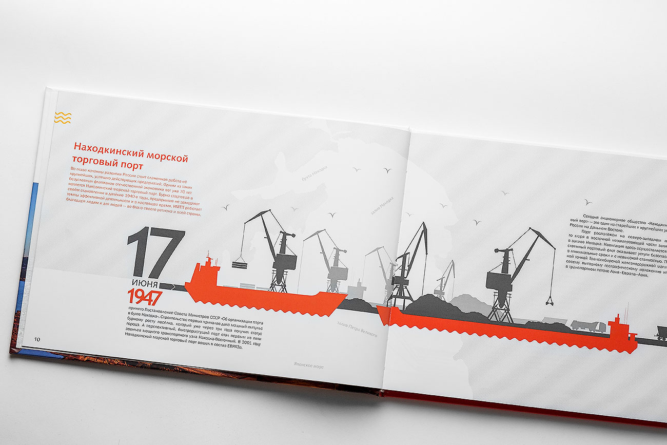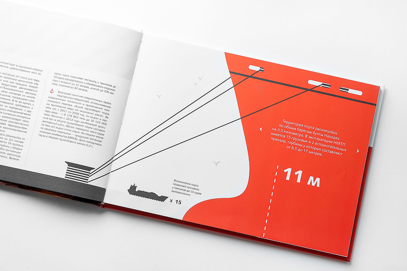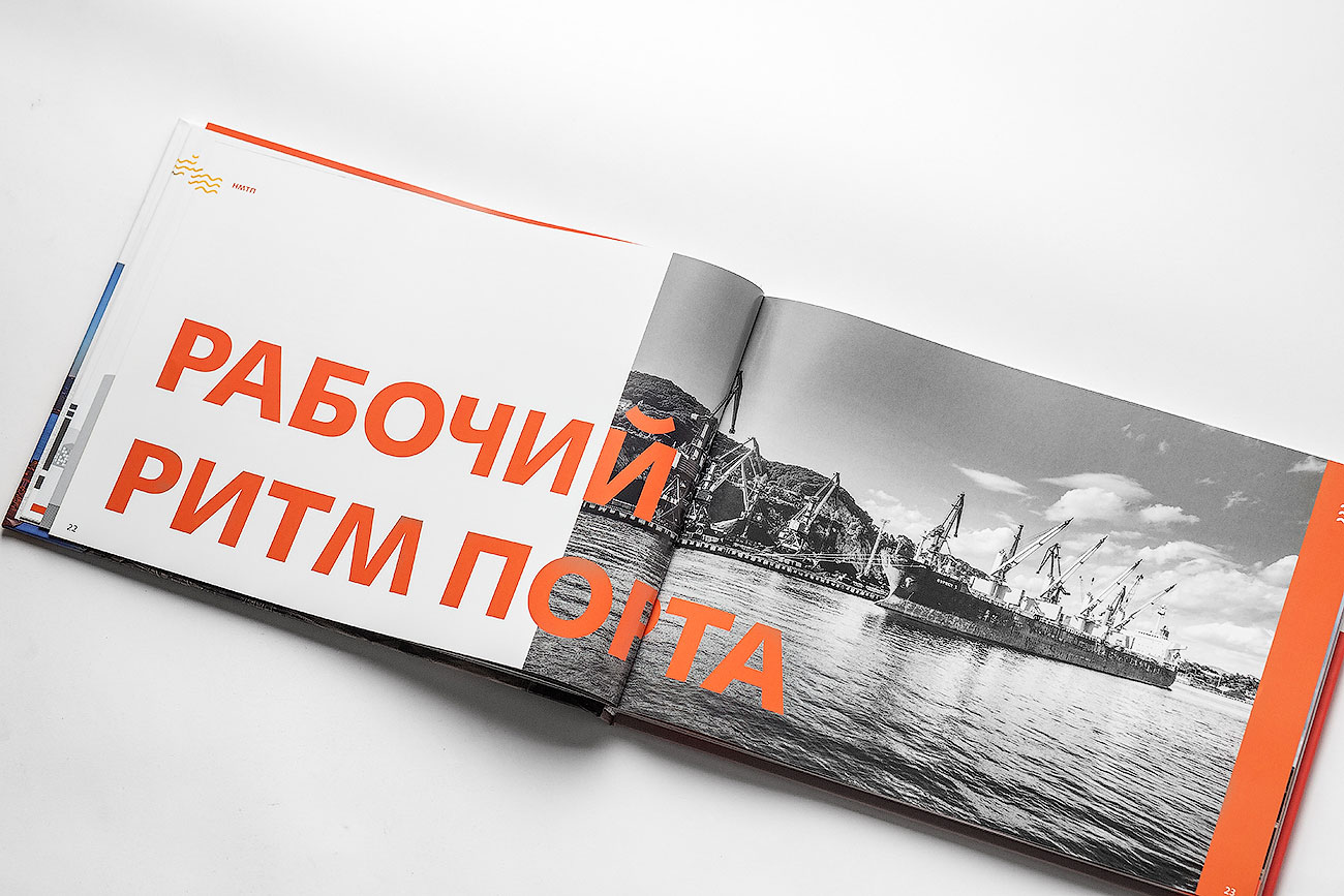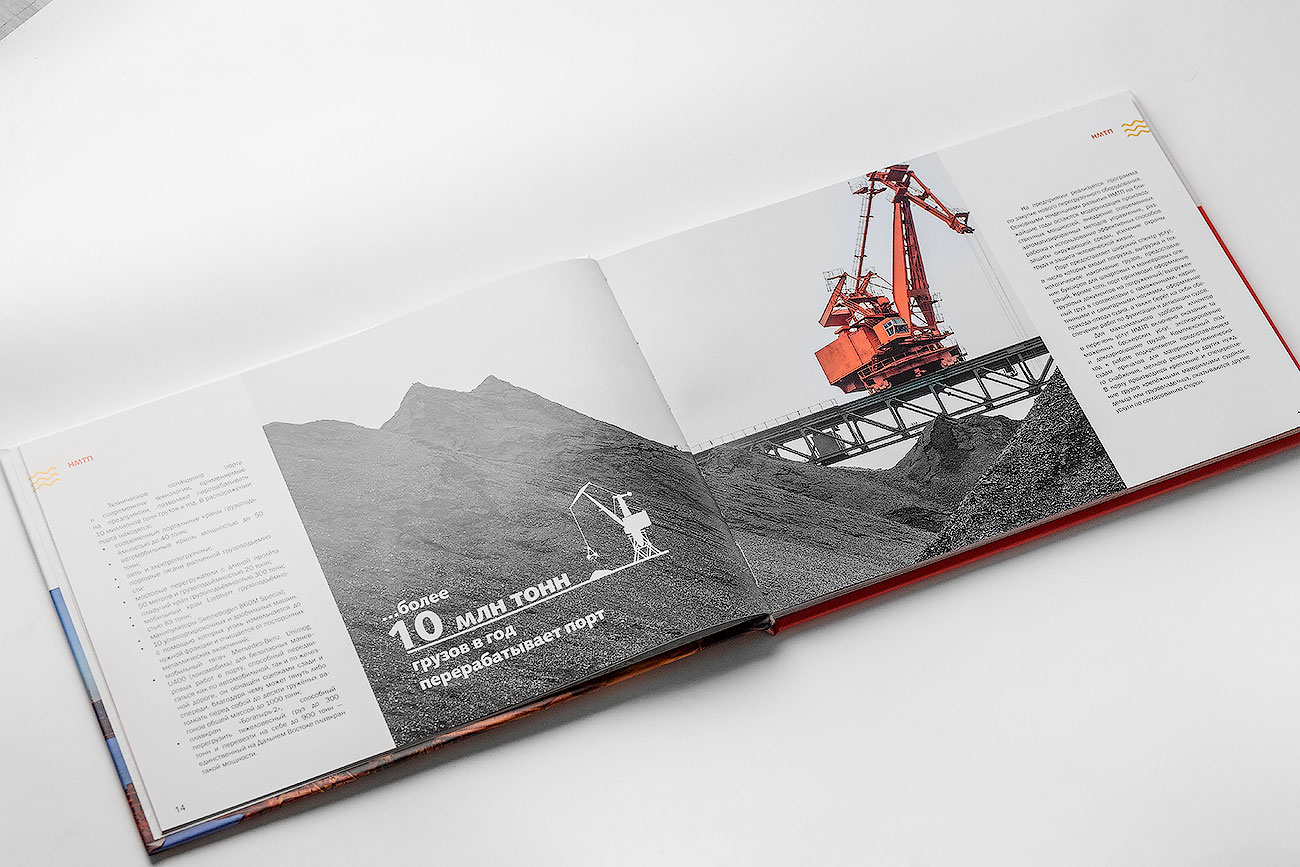 Задача фотоальбома – показать уникальность предприятия и его современный ритм деятельности, модернизацию производственных мощностей и новые автоматизированные методы управления, экологические технологии и социальный профиль компании. В центре бизнеса – человек. Акцент фотоальбома сделан на портретах как отдельных работников, так и целых коллективов. Главные события и факты порта отображены в инфографике и в кратких текстовых комментариях.