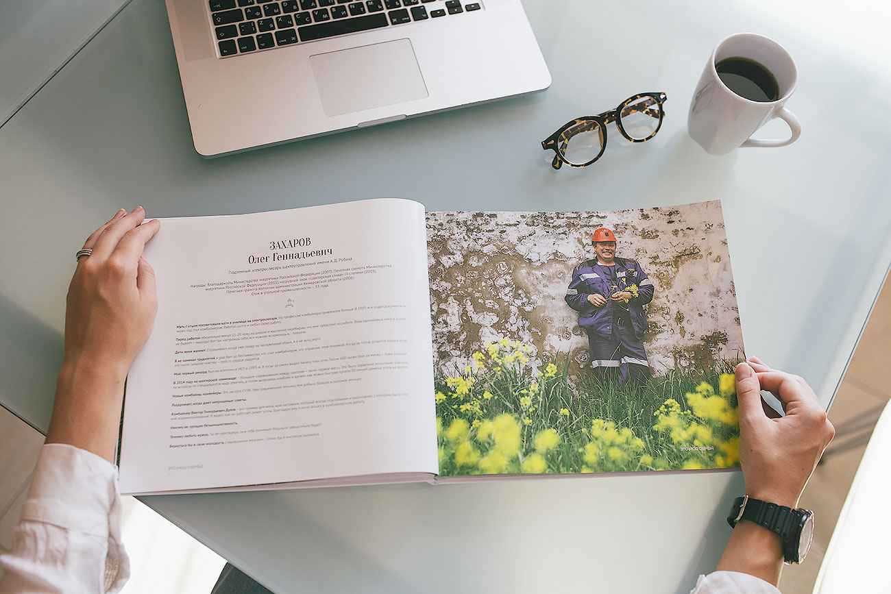 Фотоальбом содержит 40 монологов шахтеров. Наши персонажи рассказывают о трудовых буднях, семье, смысле жизни. Съемки проводились под землей, в воздухе, в домашней обстановке.